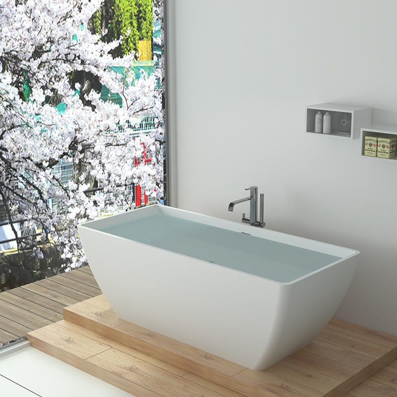 Quality and beauty come standard with this freestanding modern bathtub. The stone resin stand alone tub features a perfect blend of modern styling and simple elegance for a timeless look that is both durable and easy to clean for years of bathing serenity. The modern design of this deep bathtub is met with lush depths that cradle you in warmth and luxury for a papering, full immersion experience. This bathtub retains heat while remaining unaffected by external forces such as moisture and humidity making it an ideal high quality material. Add bold style and elegance to your bathroom with a quality stone tub that resonates luxury and class.